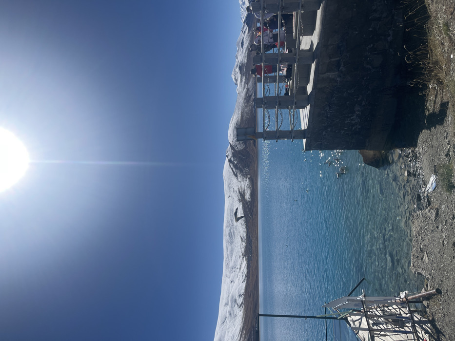 A bright sun shines over a blue sky and a lake. A grey mountain slopes down to the lake, where some birds swim in the clear water. On the right, there's a viewing platform with people. The scene is somewhat rotated, so the sky takes up a significant portion of the image. Near the bottom right is a rocky shoreline with some greenery. The water appears exceptionally clear, reflecting sunlight.