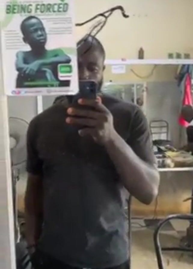 A man stands in front of a mirror taking a selfie. He is wearing a black t-shirt and dark sweatpants. A poster on the mirror reads, "Are you a child who is BEING FORCED to work beyond your ability?" The poster also includes a picture of a somber-looking child, along with text describing the kinds of situations that are considered child labor and contact information for a helpline. A few chairs, a table, and other people can be seen in the background, reflected in the mirror. The scene appears to be inside a barber shop or similar establishment.