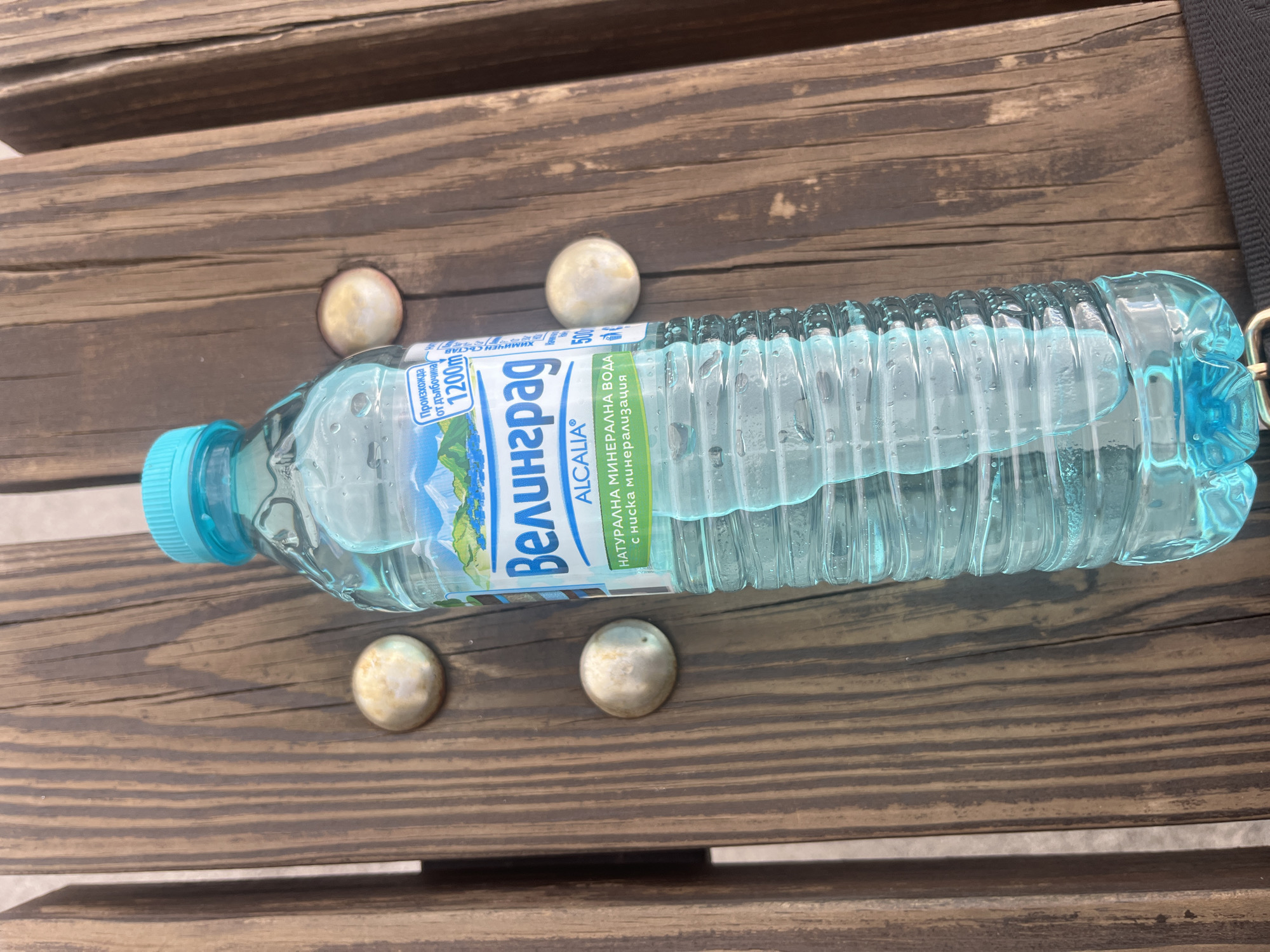 - "A plastic "Велинград" (Velingrad) natural mineral water bottle, filled with clear liquid and featuring a light blue screw cap, rests horizontally on a dark brown wooden bench" by FM-RDdli2, licensed under CC BY 4.0