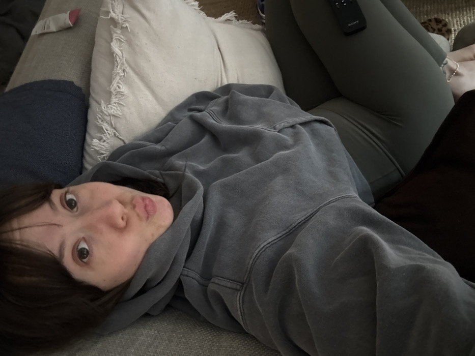 A single female subject is depicted from an overhead perspective, reclining on a sofa in an indoor domestic setting. The subject has dark brown hair with bangs and fair skin, exhibiting visible freckling on her cheeks. She is wearing a faded grey hooded sweatshirt and dark olive green leggings. Her lips are pursed, and her gaze is directed towards the camera. A thin silver chain bracelet is visible on her left wrist. Adjacent to her right side is a cream-colored throw pillow with frayed edges, with a dark blue pillow partially visible in the background. A black television remote control, bearing the 'SONY' brand, rests on her right thigh. A section of a patterned rug or blanket is visible on the floor or surface in the lower right portion of the frame. The image does not contain visual information to confirm the specific city location of London, United Kingdom, or any other geographic area.