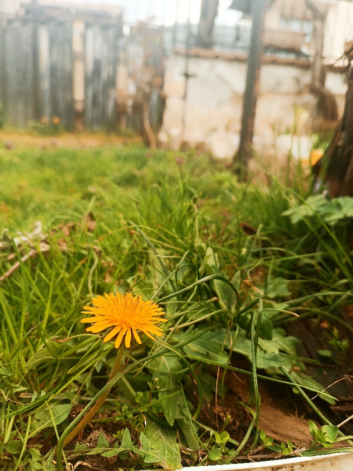 The image displays a ground-level perspective of an outdoor scene in Kulata, Bulgaria. A single, fully bloomed dandelion with bright yellow ray florets is prominently featured in the lower-left quadrant. It grows on a green stem amidst a dense patch of green grass, interspersed with other low-lying vegetation and visible dark soil. Minor organic debris is present at ground level. The background is heavily blurred and out of focus, revealing indistinct structural elements. These include what appears to be a weathered corrugated metal fence or barrier on the left, and a light-colored, possibly stuccoed wall or building section on the right. Dark, vertical, indeterminate objects, resembling posts or tree trunks, are also discernible in the blurred background. No individuals or specific actions are depicted.