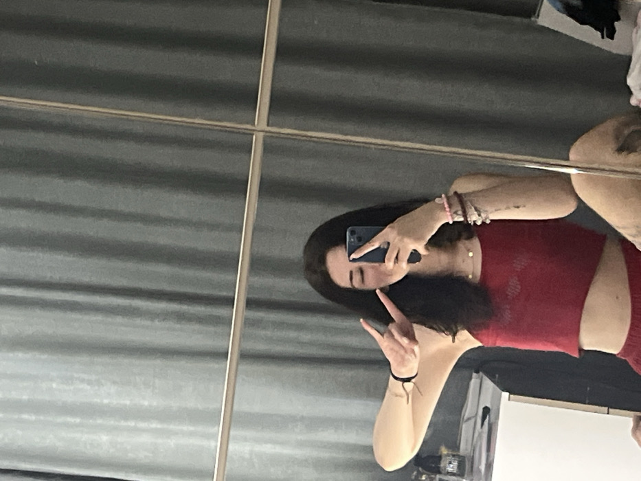 The image displays a mirror selfie of a young individual in an indoor setting. The subject has dark hair and wears a red cropped tank top paired with matching bottoms. One hand holds a blue smartphone, positioned to obscure the upper portion of the face, while the other hand is raised, forming a "peace sign" gesture. Visible accessories include multiple bracelets on both wrists and a simple pendant necklace. The background, reflected in the mirror, consists primarily of dark grey vertical curtains. To the viewer's left, a portion of a white dresser or nightstand with various objects, including bottles, is visible. The mirror itself features light-colored horizontal and vertical divisions. The indoor setting provides no discernible external features or landmarks to indicate the city of Plovdiv, Bulgaria.