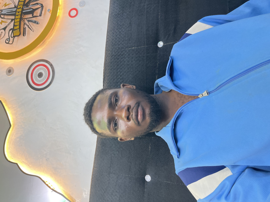A young adult male is depicted seated in an interior setting, specifically within what appears to be a barbershop located in Unguwar Gabas, Nigeria