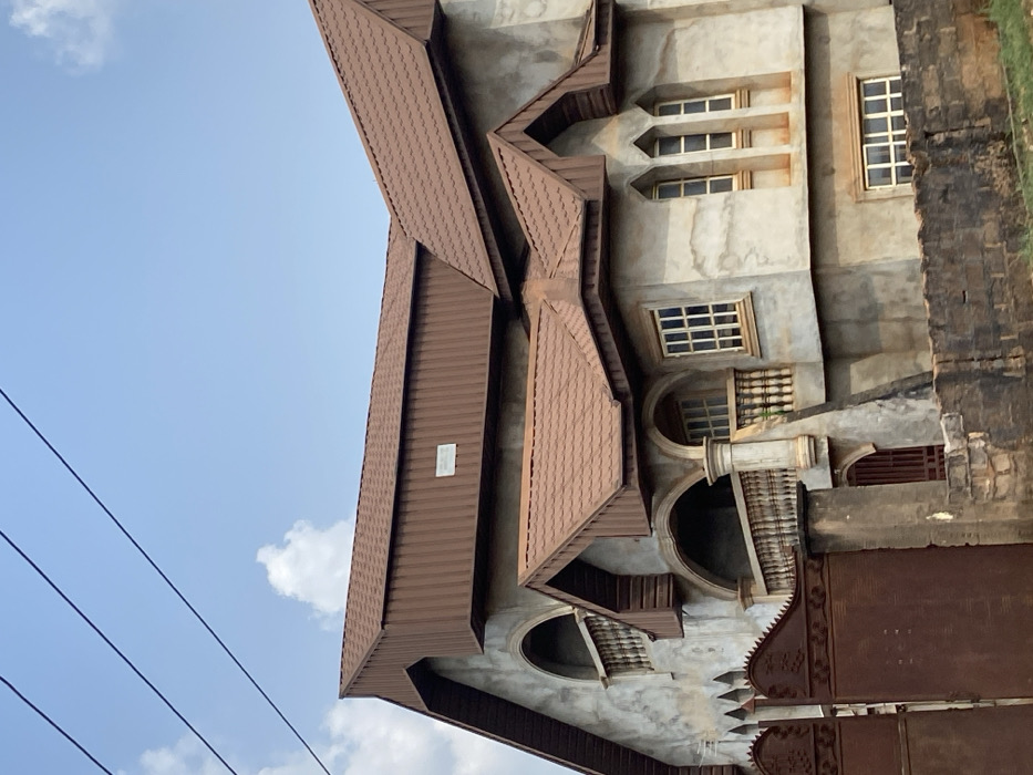 The image depicts a multi-story residential building located in Ojoto, Nigeria, observed under a clear blue sky with scattered white clouds