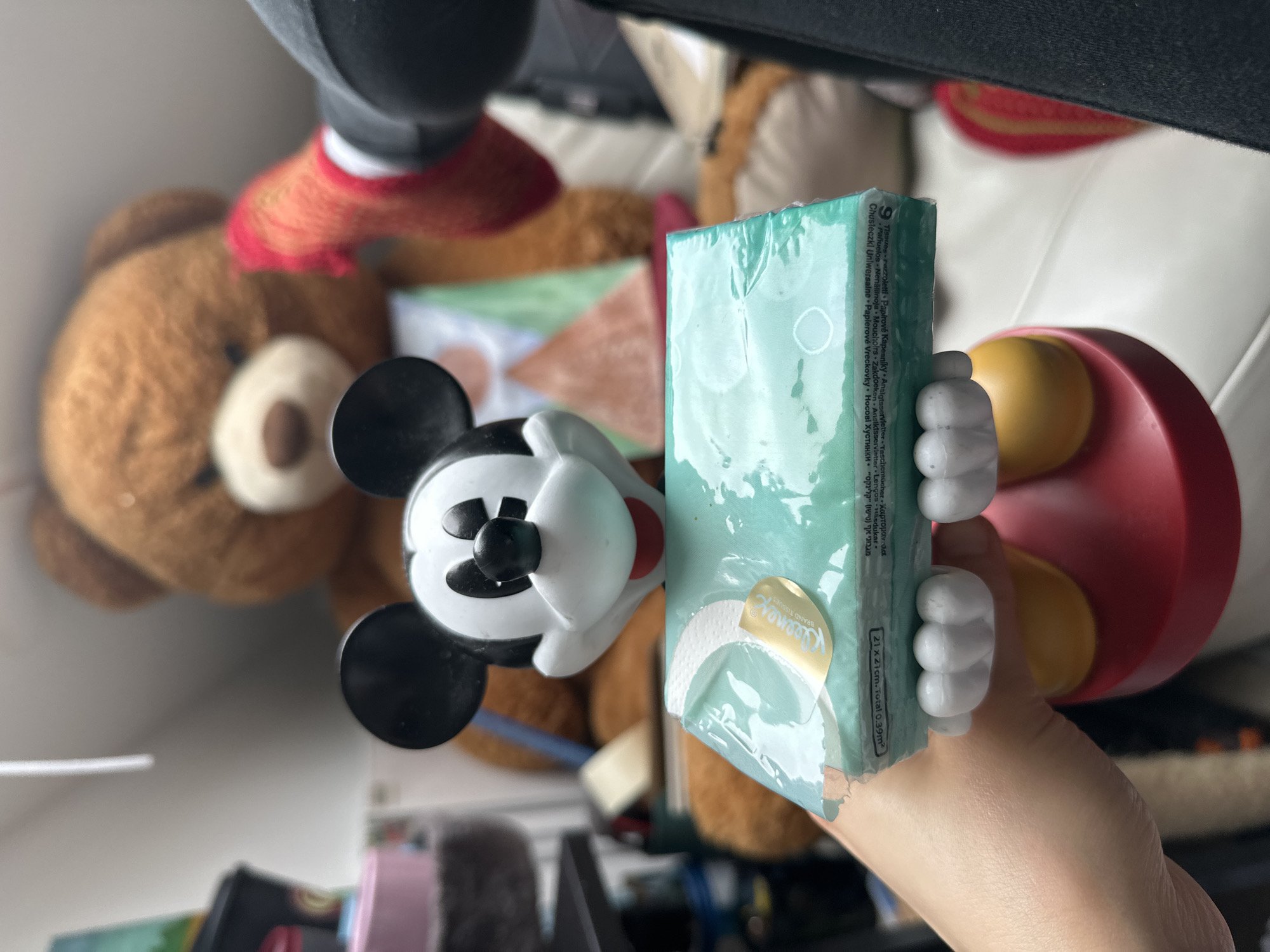 human hand holding a Mickey Mouse figurine in an indoor residential setting in Reading, United Kingdom. The figurine, white-faced with black ears, features, and yellow pants on a red base, is depicted holding a teal-colored packet of Kleenex brand tissues. The tissue packet displays the text "Kleenex BRAND TISSUES" and dimensions "21 x 21cm". In the blurred background, a large, light brown teddy bear wearing a multi-colored bib is visible. A red knitted object is partially visible to the right of the teddy bear. The background architecture suggests a room with a light-colored, angled ceiling. No other individuals are present in the visible scene.