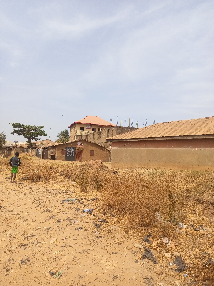 The image depicts an unpaved, dry landscape in Sabon Tasha, Nigeria, under a clear, light blue sky with sparse, wispy clouds
