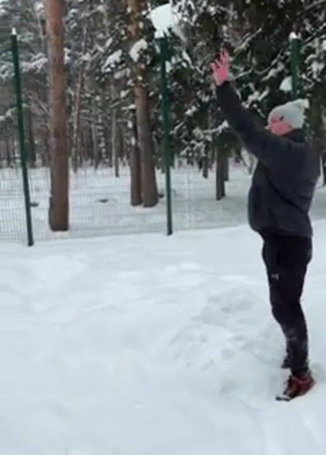 A man in a winter coat and beanie throws a snowball at a basketball hoop in a snow-covered outdoor court. The court is bordered by a wire fence and surrounded by snow-covered trees. The basketball hoop is red and white and has snow on the net.