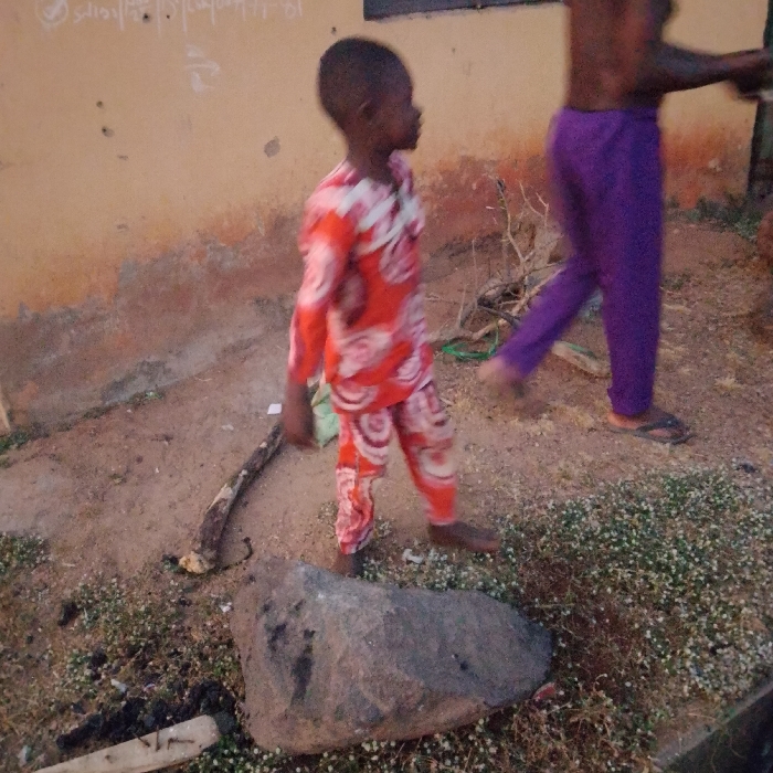 A young boy dressed in a red and white patterned pajama set stands barefoot in a yard. A large, dark rock is on the ground in front of him. Another person with bare torso is wearing purple pants and flip flops, and is walking nearby. In the background, there is a building with writing on the side. The ground is dirt and overgrown with small plants.