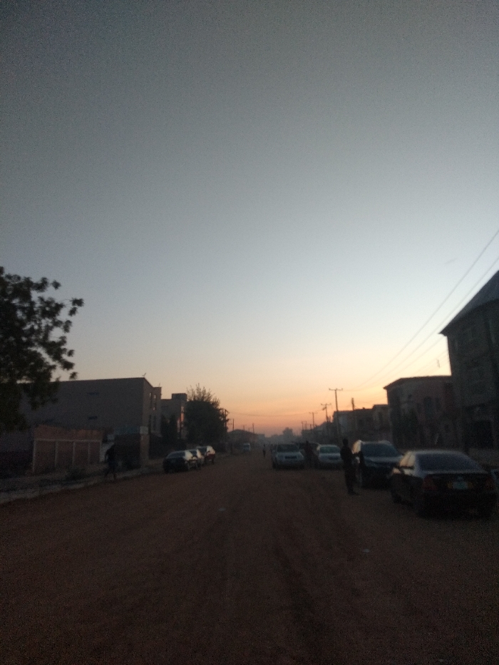 A street scene at dawn or dusk, the sky a gradient from pale gray to faint orange at the horizon. Several parked cars line both sides of a dirt road. Silhouetted figures are visible near the vehicles. Buildings with boxy shapes are on either side of the street. Overhead utility lines stretch across the sky. A tree is on the left, partially obscuring a building. The overall impression is of a quiet residential neighborhood.