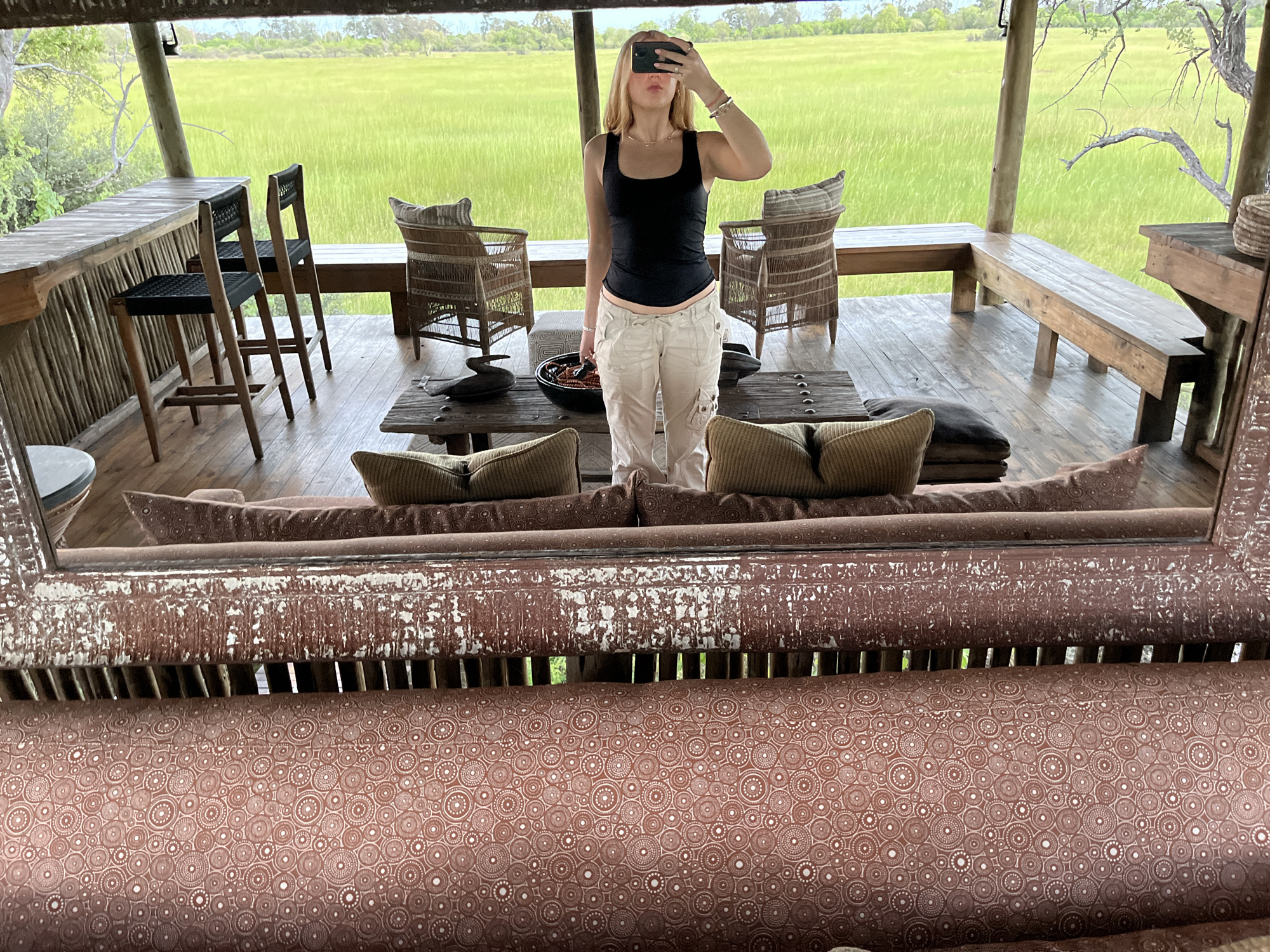 A person takes a selfie in a mirror in Khwai, Botswana. The person is a light-skinned female wearing a black tank top and beige pants. She holds a phone in front of her face. The reflection shows a covered patio area with wooden floors, chairs, and tables. Beyond the patio is a grassy field.