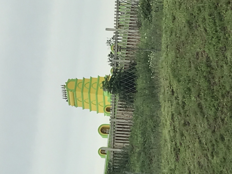 A tall, yellow and green pagoda-like structure stands behind a wooden fence. The pagoda is tiered and has rounded arches at its base. Green grass covers the foreground and extends beyond the fence. A few small trees and shrubs are interspersed within the grassy area. The sky is overcast and a pale gray color.