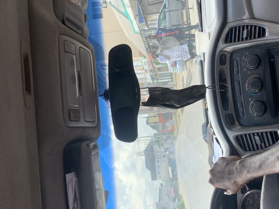 The image is taken from inside a car, looking out the windshield. The driver's right arm is visible on the steering wheel. A black face mask hangs from the rear-view mirror. There are two men standing in the street, visible through the windshield. Both men are wearing white, one has a white skullcap and the other is holding a large drum. They are standing near a white car. The driver's side of the dashboard is visible with a white cup on the dash. A sign for a store is visible in the reflection of the rear-view mirror. The scene is likely from a suburb in Umuola, Nigeria, with the coordinates: 4.891 latitude, 7.023 longitude. The street appears to be a paved road with buildings lining the sides. The sky is partly cloudy with a few white clouds. The street is relatively empty. The scene is taken from inside a car, likely a Toyota Highlander, with the steering wheel and a portion of the dashboard in view.