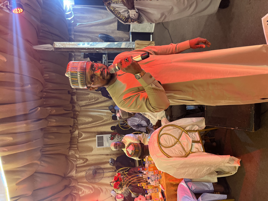 A man in a traditional hat and glasses speaks into a microphone. He wears a long robe and a watch. The setting appears to be an event, possibly a wedding or ceremony, with draped fabric in the background and seated attendees. A table with drinks and flowers is visible in the foreground. There is also another man dressed in white standing to his right.