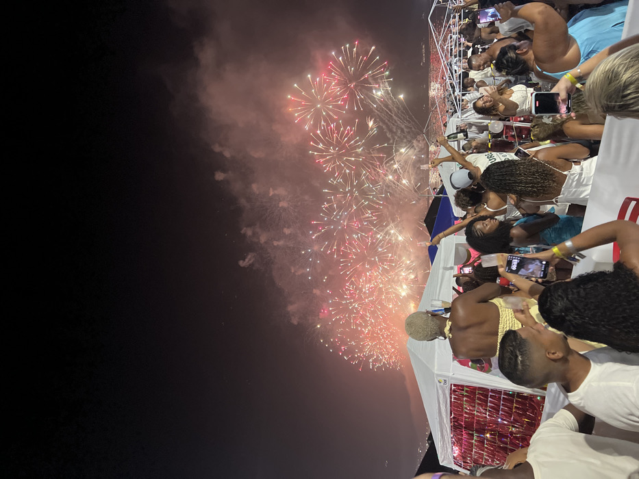 A lively nighttime gathering on a boat features many people, dressed mostly in white, celebrating with fireworks in the background