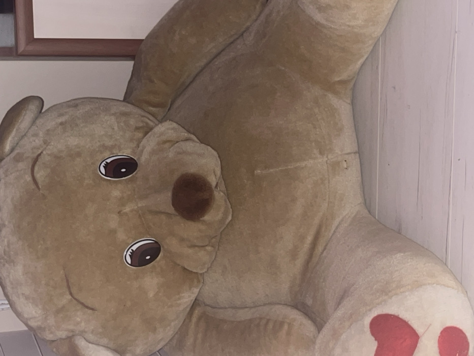 - "An unidentified indoor location features a large, light brown plush teddy bear seated on a light-colored floor composed of horizontal panels" by FM-VvMsi2, licensed under CC BY 4.0