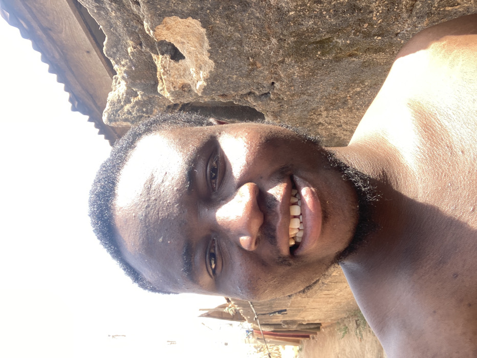 A shirtless individual, appearing to be an adult male with dark skin and short, dark hair, is positioned centrally in a close-up, front-facing shot, looking directly into the camera. He has a beard and mustache, and is smiling, revealing an upper central incisor gap and slightly discolored teeth. Strong sunlight illuminates his face and bare shoulders, casting defined shadows. To his immediate left, a narrow dirt path is visible, running alongside a light brown, possibly mud or concrete, wall. Several pieces of fabric, appearing to be clothing, hang on a line over this wall, stretching into the background where other basic structures are faintly discernible under a bright, clear sky. To his immediate right and slightly behind him, a textured, light brown structure or rock formation with a rough surface is present. Above this, a segment of a corrugated metal roof, appearing aged and possibly rusty, is visible, extending into the upper right corner of the frame. The scene is outdoors, under direct sunlight, in what appears to be a residential or semi-rural area of Yelwa, Nigeria.
