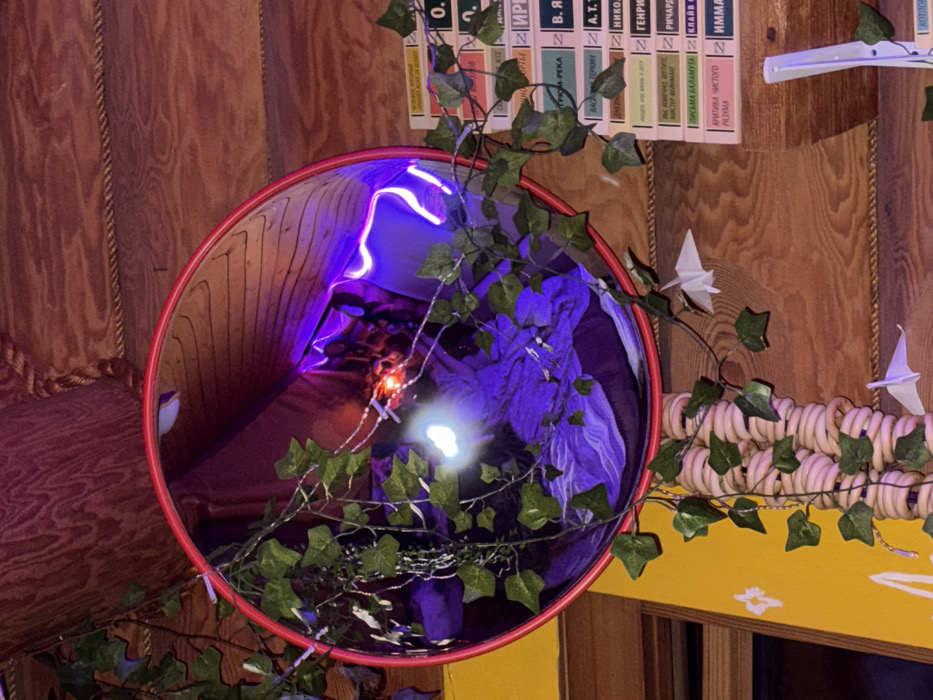 This image depicts an indoor scene in Toksovo, Russia, dominated by a circular convex mirror with a prominent red frame, positioned centrally. The mirror reflects a blurred interior space characterized by strong purple and blue neon lighting, a bright circular light source, and a string of small, illuminated points, some red, suggesting fairy lights. Faux ivy vines with green leaves are draped around the mirror, intertwining with the frame and extending downwards. The surrounding environment consists primarily of wooden paneling, visible as horizontal planks with distinct grain patterns. A section of the wall to the left of the mirror is painted yellow and features a subtle white geometric stencil pattern. Below the mirror, partially obscured by ivy, is a vertical decorative element composed of light-colored, stacked, ring-shaped components or coils. Several white origami paper cranes are scattered around this area, with at least three distinctly visible. To the right of the mirror, a stack of approximately ten books with Cyrillic text on their spines is arranged horizontally against the wooden paneling. Identifiable titles include "КРИТИКА ЧИСТОГО РАЗУМА" (Critique of Pure Reason), "ПИСЬМА БАЛАМУТА" (The Screwtape Letters), "ВЫ, КОНЕЧНО, ШУТИТЕ, МИСТЕР ФЕЙНМАН!" (Surely You're Joking, Mr. Feynman!), "ДЮНА" (Dune), "ОДИССЕЯ КАПИТАНА БЛАДА" (Captain Blood), and "ВАСИЛИЙ ТЕРКИН" (Vasily Terkin). A white, vertical, tubular object, possibly a light fixture or conduit, is partially visible at the bottom right, next to the book stack. No individuals are present or discernable in the scene.