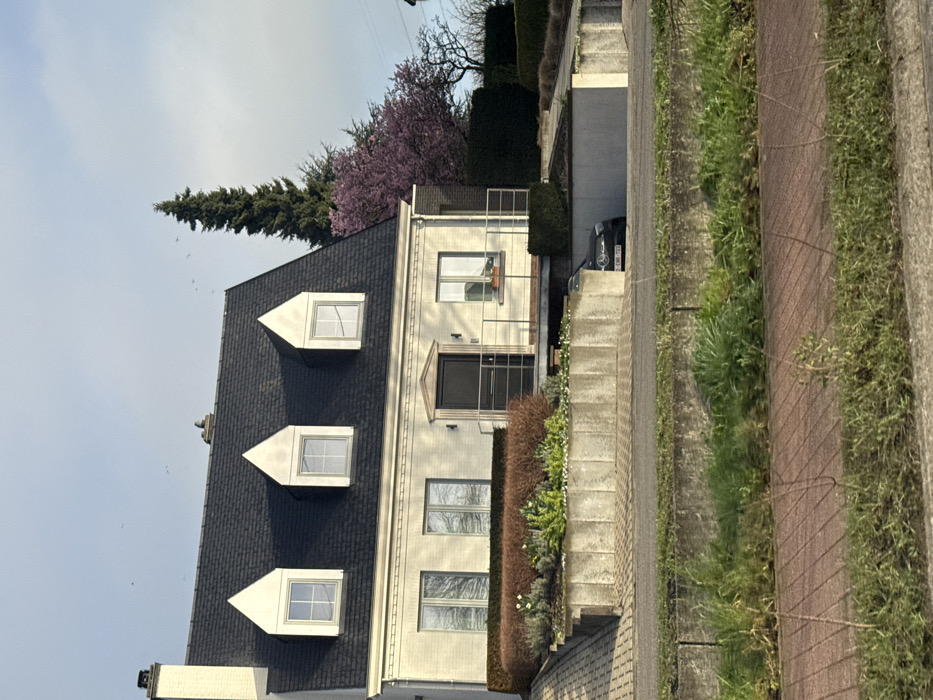 A static exterior view depicts a residential property in Temse, Belgium, under a light blue sky with scattered clouds. The central subject is a two-story detached house constructed with light-colored brick, featuring a dark grey shingle roof with three prominent gabled dormers, each containing a white-framed window. A white chimney stack is visible on the left side of the roof. The house's main entrance, a dark door, is elevated and accessed via a short set of steps with a silver-colored metal railing. The door is flanked by two external wall-mounted lights. Multiple rectangular windows with white frames are present on both floors of the facade. The property features tiered landscaping supported by concrete retaining walls. Directly in front of the elevated house entrance, a trimmed green hedge is visible, with a garden bed containing small white and yellow flowering plants situated on top of a lower concrete wall. A dark-colored Mercedes-Benz automobile, bearing a partially visible Belgian license plate "1-ENR-712," is parked or partially obscured within a recessed garage or carport area beneath the elevated section of the house. To the right of the residence, a tall, conical evergreen tree stands beside a tree in full bloom, characterized by dense purple blossoms. Further right, dark green hedges define the landscape, ascending a slope. In the foreground, a strip of unkempt green grass and weeds borders a red brick pathway or sidewalk, separated by a concrete curb. Several small, dark avian forms are visible against the sky. No human subjects are present.