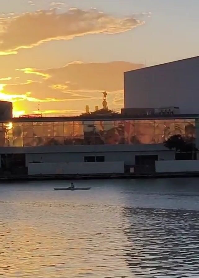 A lone kayaker is paddling across the water, silhouetted against a striking sunset. The sky is a mix of orange and yellow, with scattered clouds. Behind the water, a long, modern building with glass windows is visible, reflecting the colors of the sunset. To the right of this building is a taller, blocky structure. The water is calm with subtle ripples, mirroring the sky's colors. The overall scene is serene and tranquil.