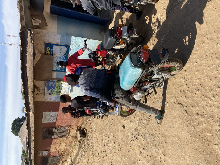 The image depicts an outdoor scene on an unpaved section of Rukuba Road, Nigeria, under clear daylight. The ground consists of dry, reddish-brown earth mixed with small rocks and debris. To the left, a dilapidated single-story building features reddish-brown, cracked plastered walls with two barred windows and a corrugated metal roof. A large tree with green foliage stands behind this structure. To the right, another single-story building, painted light blue and off-white, also has a corrugated metal roof. Multiple posters are affixed to its exterior, including one displaying water bottles with the text "EPO 33073165" and another with text relating to "MALARIA." Six adult males are present. In the foreground, one male, wearing a black beanie, a blue and grey striped long-sleeved shirt, distressed dark jeans, and dark sandals, sits astride a red motorcycle with a light blue seat cover and green and red accents on its wheels, facing away from the viewer. In the midground, a group of four males is visible. One male, wearing a dark long-sleeved garment and a dark beanie, is seated on a red motorcycle to the left. Another male stands centrally, wearing a red long-sleeved shirt and a black beanie, holding the handlebars of a red motorcycle with a "TVS" branded seat and a partially visible license plate "B504YAA." Adjacent to him, a third male stands in a dark t-shirt. A fourth male is partially visible to the right, wearing a dark jacket and a cap. A fifth male is partially obscured behind the motorcycle on the far left. At least four motorcycles are present in total, parked on the dirt ground. The sky is light blue with minimal white clouds. Two communication towers are visible in the distant background. Strong shadows are cast from the individuals and motorcycles, indicating direct sunlight. The individuals appear to be gathered, though specific interactions are not distinctly visible.