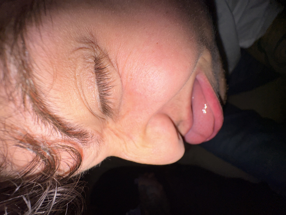 The scene, located in the city of Unknown, Unknown, captures a close-up, diagonal view of an individual's right facial profile. The person is performing a deliberate grimace: the right eye is tightly shut, the brow and nose bridge are heavily wrinkled, and the mouth is open with the tongue slightly protruded. Light stubble is present on the cheek and jawline. Dark, wavy hair is visible on the upper left portion of the head. The individual is partially clothed in what appears to be a dark blue fabric on the lower left and a white fabric on the lower right. The immediate background is uniformly dark, indicating low ambient light or a shallow depth of field, with the subject brightly illuminated by a direct light source.