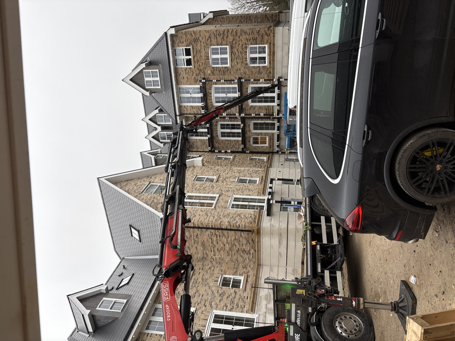 A red Fassi F800XP crane truck is parked next to a black Porsche Cayenne on a dirt surface. The crane extends towards a brick building with white-framed windows, under a cloudy sky. The building features multiple pitched roofs and dormers. Stabilizer legs are deployed from the truck. The scene appears to be a construction or delivery site.