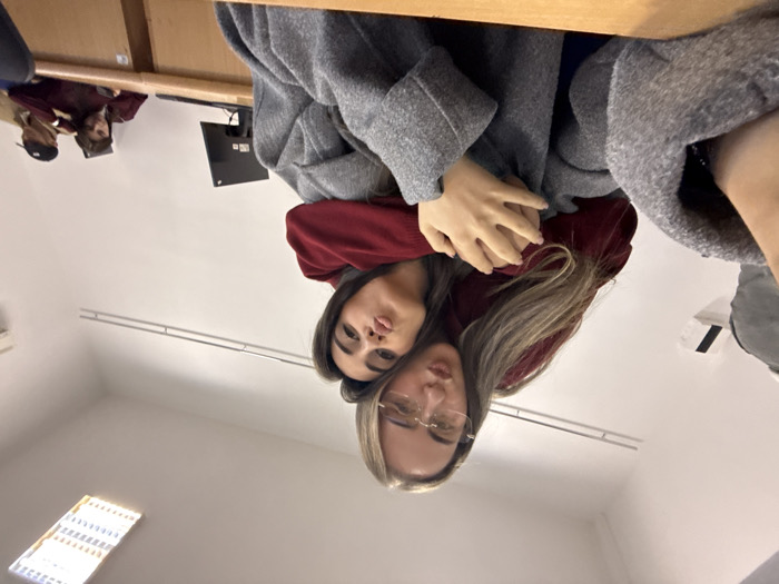 This image depicts an indoor scene within a classroom or lecture hall in Yerevan, Armenia. The foreground features two young females posing for the camera. The female in the rear, with long light hair, transparent-framed glasses, and a dark red hooded sweatshirt, has her arms wrapped around the female in front. Both individuals have their lips pursed. The female in front has dark hair and wears a grey coat over a dark red garment; her hands are clasped over the hands of the female behind her. The background consists of white walls with a horizontal metallic trim and a rectangular fluorescent light fixture on the ceiling. Wooden desks are arranged in rows, with a black flat-screen monitor visible on one desk to the right. Multiple other individuals are partially visible in the background, seated at desks; one person on the right, wearing a dark red top, leans on the desk looking downwards, while another person next to them wears a light top and a black baseball cap.