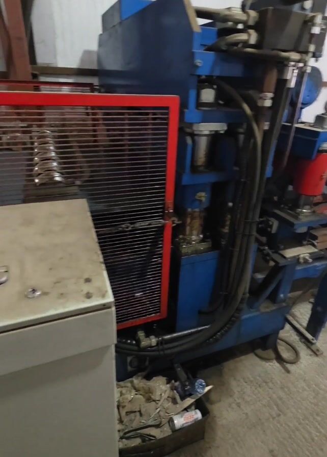 industrial machinery in what appears to be a large warehouse or factory. The primary focus is on a blue metal machine with hydraulic components and a control panel, which seems to be in operation, evidenced by sounds of machinery. Beside it, there's a metal structure, and a box filled with what looks like scrap or waste. The camera pans to show a control panel, then shifts to a broader view, revealing a long, enclosed structure filled with spherical objects, possibly metal balls or similar industrial components. The environment suggests a production or manufacturing setting. The building itself is constructed with metal beams and corrugated walls, typical of industrial buildings.