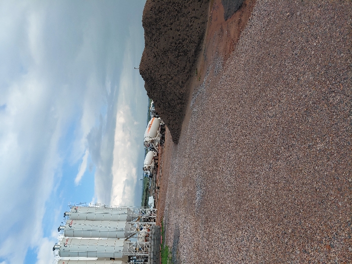 This image displays an industrial site in Bni Yakhlef, Morocco, characterized by elements associated with concrete or construction material production. The foreground is composed of a vast area covered with light brown gravel. To the left, a series of at least six tall, white industrial silos, supported by a metal framework and integrated with pipes, are prominent. Adjacent to the silos, two white concrete mixer trucks, each featuring distinct orange branding on its rotating drum, are visible. To the right, a large, dark brown mound of soil or earth occupies a significant portion of the midground, with a small, dark, unidentifiable object positioned at its peak. Patches of reddish-brown dirt are observable beneath the vehicles and at the periphery of the soil mound. The distant horizon reveals faint topographical features. The sky is partly cloudy, exhibiting both clear blue sections and extensive formations of white and grey clouds. No individuals are present in the scene.