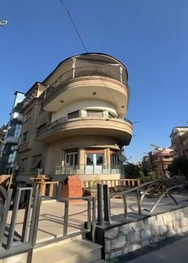 The camera angle is low, facing up towards a unique three-story building. The top two floors of the building feature rounded balconies. The building is light brown and cream colored, with iron railings on the balconies. Below the building is a stone retaining wall with a metal railing. There is a blue sky behind the building. A few trees are visible on the left and some buildings are on the right. There is a thin black wire cutting across the sky.