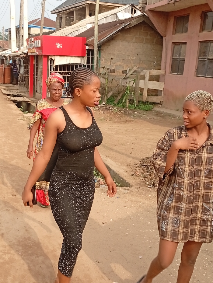 The image displays a daytime street scene in Aba, Nigeria. Three females are present on an unpaved dirt road. In the foreground, a young adult female with black cornrow braids is positioned left of center, wearing a form-fitting black sleeveless midi-dress embellished with reflective dots. She holds a dark smartphone in her left hand, and her head is turned to the right with her mouth slightly open, suggesting speech. To her right, a second young adult female with short, light-colored, curly hair wears an oversized brown plaid shirt with white embroidery. She faces the first individual, with her left hand near her chest, indicating involvement in a verbal exchange. An older adult female, dressed in a red and gold patterned headwrap and coordinating attire, walks in the background behind the primary subject, moving in the same direction. The environment consists of an unpaved, light brown dirt road. Structures line both sides of the street. On the left, a red commercial kiosk with barred windows is visible, adjacent to other buildings featuring corrugated metal roofs. Two brown industrial-sized gas cylinders stand vertically near the left edge, and a wooden plank bridge crosses an open drainage culvert. On the right, a two-story building with a light brown facade and multiple framed windows is present. Behind the second young female, a smaller concrete block structure with a corrugated metal roof is partially visible, fronted by sparse vegetation and wooden supports. The lighting is natural daylight, consistent with an overcast sky.