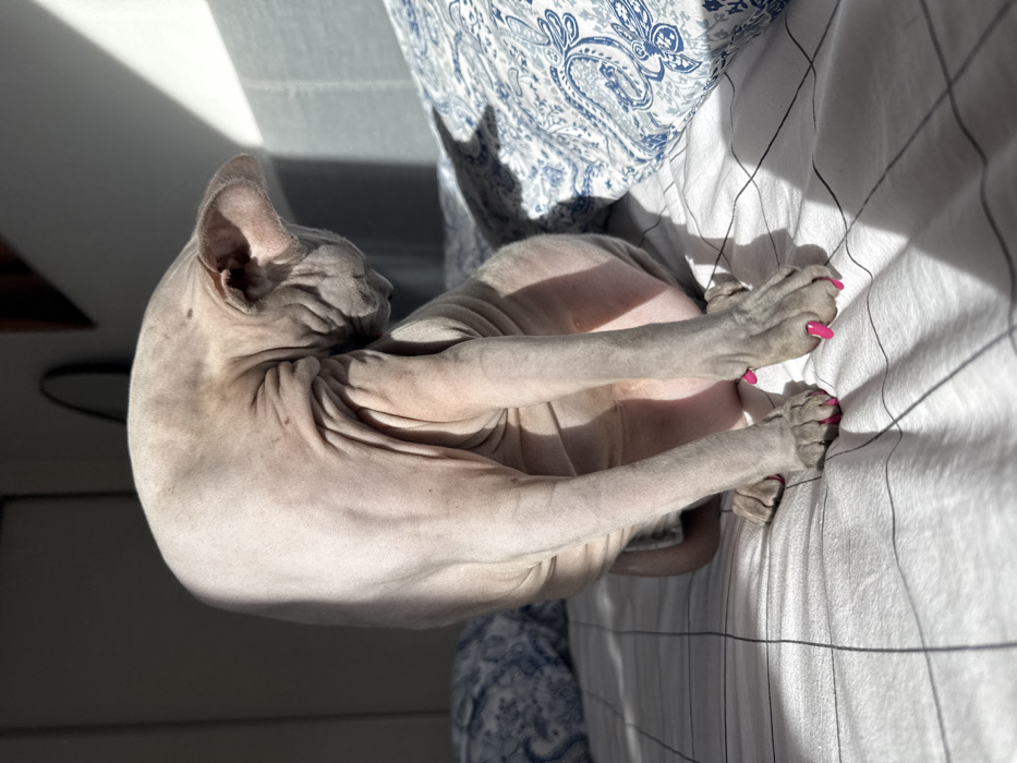 - "A hairless Sphynx cat with light pinkish-grey, wrinkled skin sits upright on a bed, its head bowed and gaze directed downwards" by FM-4WEif2, licensed under CC BY 4.0