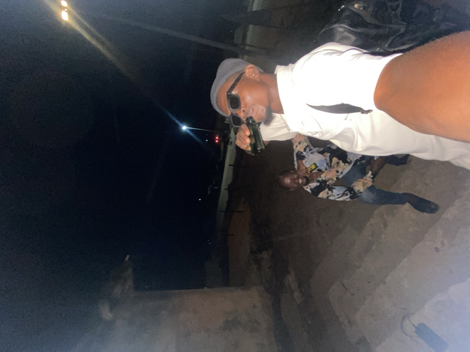Two men are outdoors at night. One man stands, wearing a grey beanie, sunglasses, and a white shirt, holding a green bottle to his mouth. The other man is on the ground, in a floral shirt and jeans, with a yellow item around his neck. The ground appears to be concrete or dirt. Streetlights are visible in the background, and it's quite dark. The photo is taken at a tilted angle, making it harder to discern the exact location.