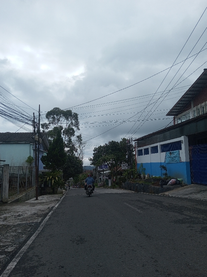 A street scene under a cloudy sky. A man rides a scooter down a paved road flanked by buildings and trees. Power lines crisscross overhead. The building on the right is partially painted blue and white, while the one on the left is light blue. A sign is visible in front of a building further down the street. Vegetation lines the sides of the road.
