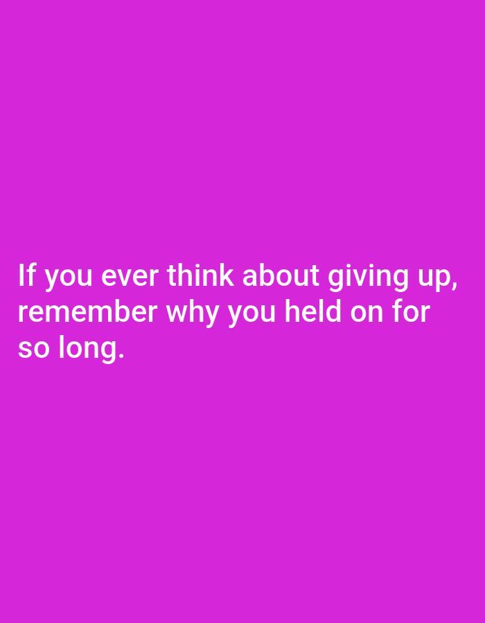 The image features white text on a solid purple background, conveying a motivational message. It reads, "If you ever think about giving up, remember why you held on for so long." The text is centrally aligned within the frame, with each line stacked neatly above the other. The simple design places emphasis on the encouraging and reflective nature of the quote.