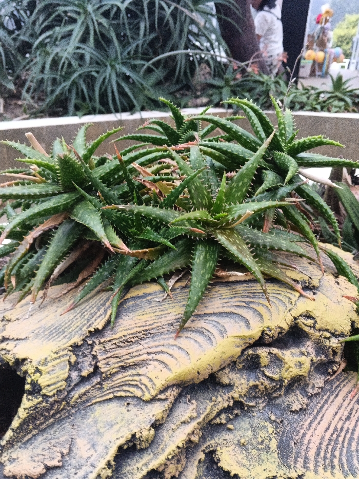 A close-up shows several aloe plants atop a weathered, beige and gray, stone-like structure. The aloes feature spiky, green leaves tinged with red at the tips, radiating from central points. In the background, a blurred view shows more green foliage and indistinct figures, suggesting an outdoor garden or park setting. The rough texture of the stone contrasts with the smooth leaves of the plants.