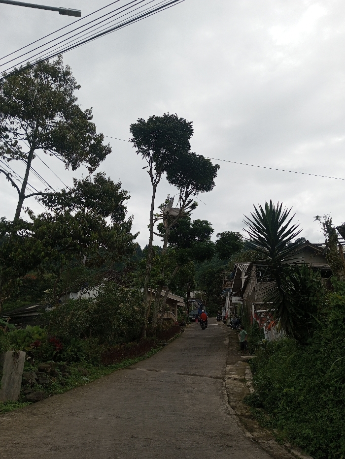 This image captures a narrow, paved residential street in Cibodas, Indonesia, under an overcast sky