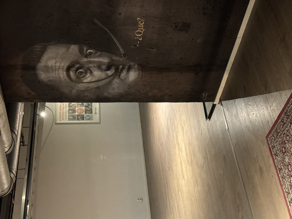 This image depicts an interior view of a commercial or event space located in Vaasa, Finland. The specific venue is advertised on a framed poster on the back wall as offering "suitable halls" for parties, meetings, and events in Vaasa under the "Forever" brand, suggesting it is Forever Club Vaasa or an associated facility. The scene is dominated on the right by a dark, vertical pillar featuring a large, grayscale mural of Salvador Dalí's face. Dalí is depicted with wide, exaggerated eyes, his signature upturned mustache, and a melting, spectacle-like element over his left eye. A pipe extends horizontally from the right side of his face. Below the mural, in golden lettering, are the words "...- ¿Que?". At the very bottom right, a black rectangular tray with a textured surface is partially visible against the pillar and the wooden floor. To the left of the pillar, an open, minimalist room is visible, characterized by light-colored, possibly off-white, walls and a light-toned wooden laminate or parquet floor. A red oriental-style rug with intricate patterns is positioned in the bottom-left corner of the foreground. Exposed metallic ventilation ducts or pipes traverse the ceiling horizontally, contributing to an industrial aesthetic. Several recessed spotlights are visible on the ceiling structure, illuminating the space. A wall socket is present on the left wall at waist height. No individuals are present in the scene.