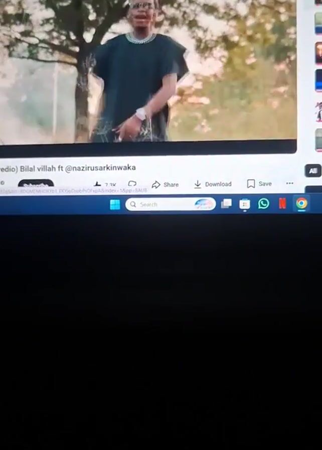 A person is filming a computer screen playing a music video. The video features a dark-skinned man with sunglasses and jewelry dancing outdoors. There are trees and foliage visible in the background. The song title is "Bilal villah ft @nazirusarkinwaka." The YouTube player is visible with options like "Share," "Download," and "Save." The Windows taskbar is also visible with icons for various applications.
