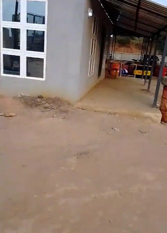 dusty, open area, seemingly an outdoor lot or yard. There are various objects scattered around, including metal drums, tires, and piles of cylindrical objects, potentially pipes or tubes. In the background, there's a large, open-sided structure with a roof, possibly a shed or warehouse. Beyond that, the view extends to a horizon line with some trees and a pale sky. The camera pans across the scene, providing a general view of the area and its contents. A security wall topped with barbed wire surrounds part of the area. The ground is primarily dirt and gravel. There are no visible people or animals in the frame.