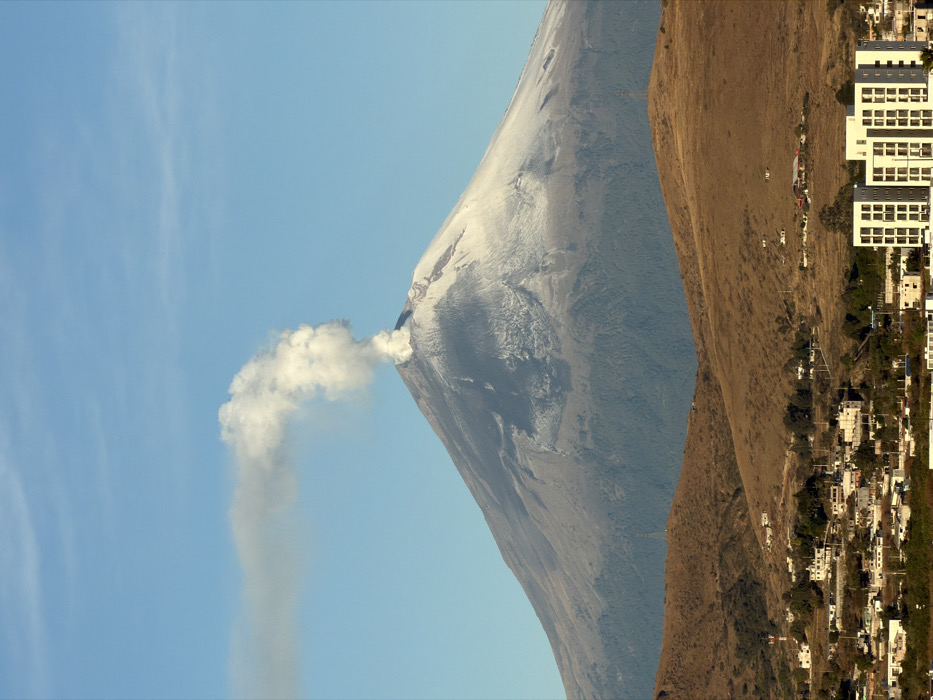 - "The image displays the snow-capped Popocatépetl volcano, actively emitting a dense white smoke plume from its summit, viewed from Santa Clara Ocoyucan, Mexico" by FM-PGnDP2, licensed under CC BY 4.0