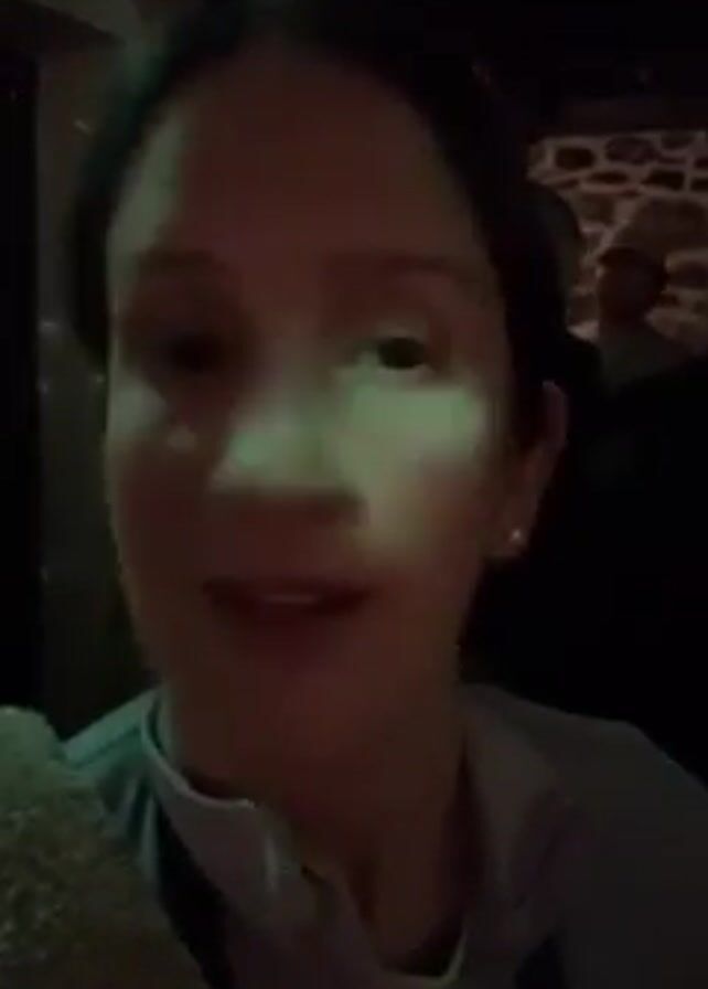 A medium close-up shows a woman with fair skin, dark hair pulled back from her face, and a light-colored jacket, speaking to the camera. The lighting is dim, but alternates between greenish and red. In the background, blurred figures are visible, and a stone wall can be partially seen. Upbeat music plays. The woman's expression varies from neutral to smiling slightly, and she moves her hands a few times.