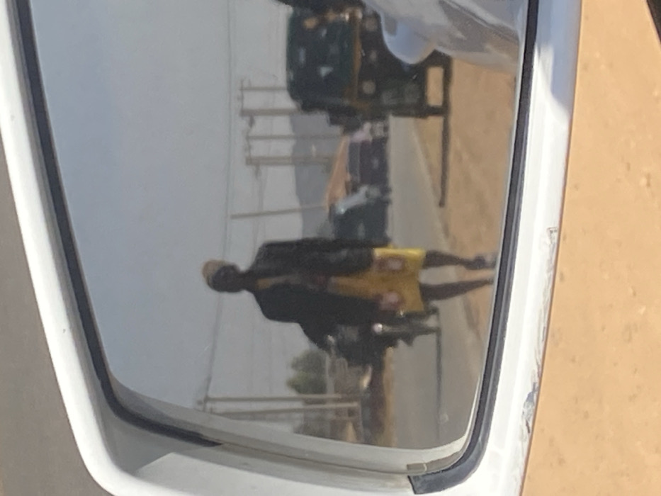 This image is a reflection captured in a white passenger-side vehicle mirror, framed by a black rubber seal and the tan body of the vehicle. The scene depicts a sunny outdoor environment in Unguwar Saya, Nigeria. A tall, slender individual, wearing a light-colored cap, a dark jacket, and bright yellow shorts or a short skirt, is centrally positioned, walking towards the right within the reflection. Dark footwear is visible on their left foot. To the left of this individual, a motorcycle is partially visible, moving away from the viewer. To the right, a green and black three-wheeled vehicle, possibly an auto-rickshaw, is present. Several other indistinct vehicles are visible in the background. The environment includes a paved road with a dirt shoulder on the right, multiple utility poles with overhead wires, and distant hills under a clear sky.