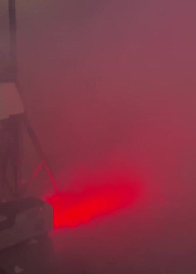 dark, smoky room, possibly a nightclub or event space. A speaker on a stand is visible on the left, next to a light machine projecting a red beam. The light fluctuates in intensity and color, sometimes appearing purple. The room is filled with smoke, and there are faint glimpses of people in the background. The overall atmosphere is dimly lit and active.