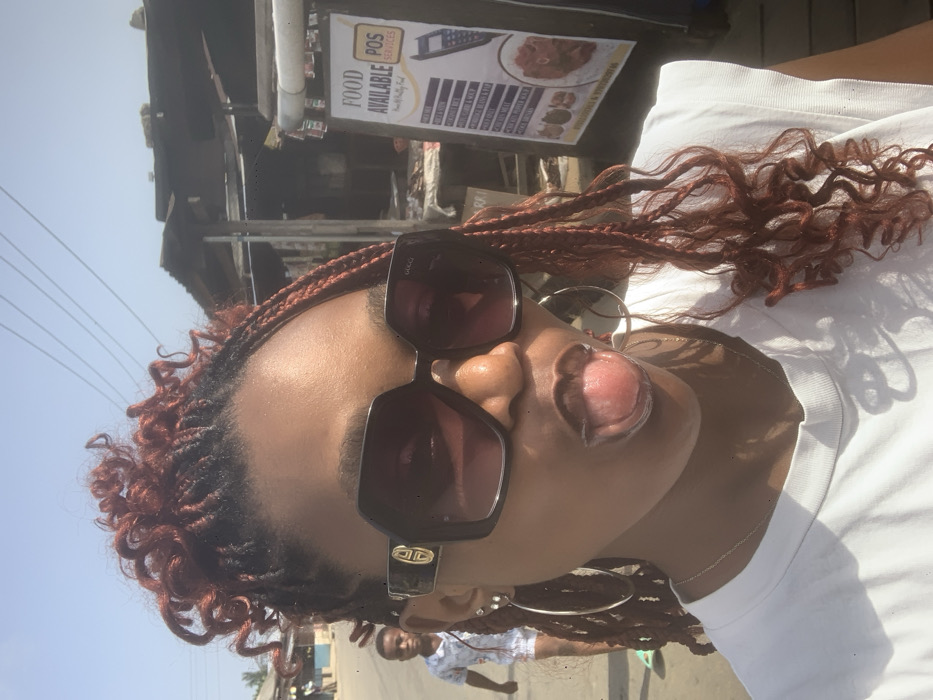 A close-up image shows an adult female in Anantigha, Nigeria, posing for a selfie. Her complexion is dark, and her hair is styled in reddish-brown braids, partially gathered upwards and loose over her shoulders. She wears large, dark-tinted rectangular sunglasses with a visible Gucci logo on the temple, silver-toned hoop earrings, multiple ear studs, and a thin silver chain necklace over a white sleeveless garment. Her tongue is protruding from her mouth. In the mid-ground, a young dark-skinned male child walks away from the camera on what appears to be an unpaved road. To the right, a weathered market stall with a corrugated metal roof stands beside a white signboard advertising "FOOD AVAILABLE" and "POS SERVICES." The signboard lists food options including "Rice & Stew," "Beans & Plantain," "Yam Porridge," "Eba & Soup," "Amala," "Pounded Yam," "Moimoi," "Akara," "Egusi," "Okra Soup," and "Chicken Pepper Soup," and features an illustration of a POS terminal. Overhead, power lines span across a clear sky. Further down the street on the left, additional structures with various roofing are visible.