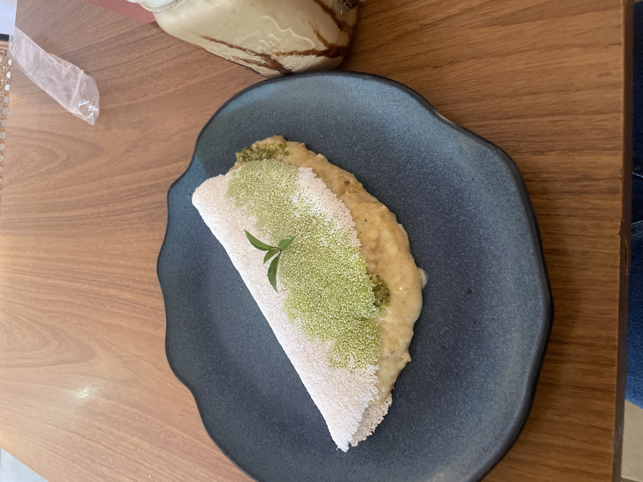 The image displays a culinary scene, ostensibly set in Anápolis, Brazil. A semi-circular tapioca crepe occupies the center of a dark blue, wavy-edged ceramic plate. The tapioca's exterior is white and granular. A significant portion of its upper surface is covered with a finely granular, light green substance, possibly matcha powder. A small sprig of two green leaves is centrally placed on this green powder. Beneath the tapioca's white exterior, a creamy, pale yellow-beige filling is visible, slightly extruding from the crepe's folded edge. To the right of the plate, a clear glass bottle with a white cap contains a light-colored beverage, likely a milkshake, with streaks of dark brown syrup adhering to the interior walls. The items rest on a light brown wooden table featuring a visible grain pattern. In the upper right corner of the table, a crumpled, translucent plastic wrapper is present. The overall lighting is bright and even. No individuals or active interactions are depicted.
