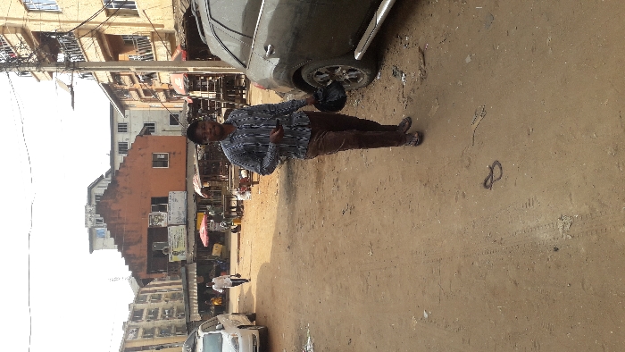 The image captures a daylight scene on an unpaved, reddish-brown dirt road in Onitsha, Nigeria, characteristic of a commercial or market district