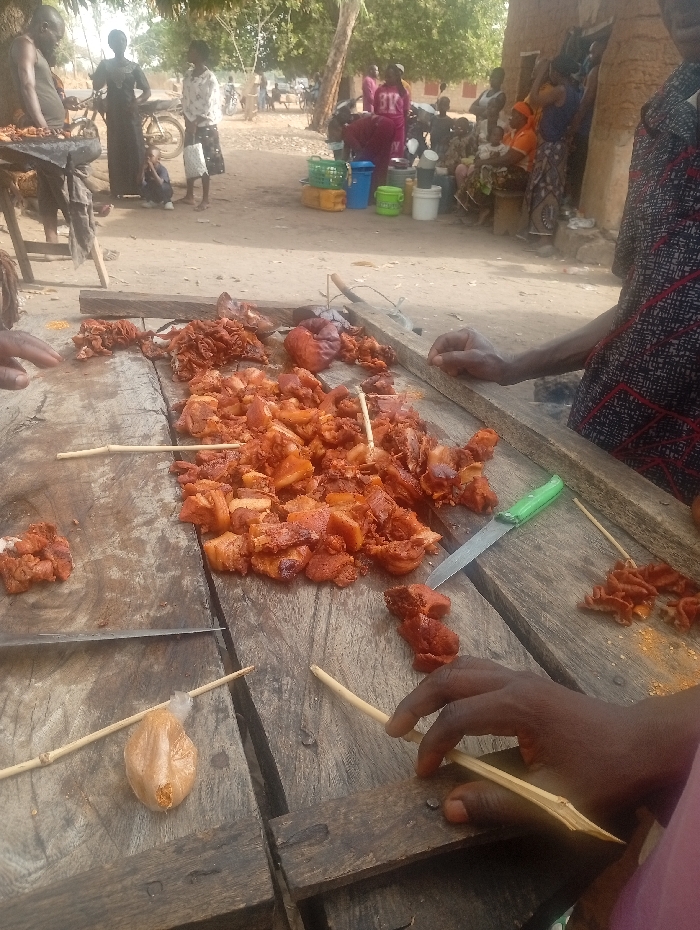 street food stall in Gundzhe, Nigeria, located at coordinates 8.981 latitude and 8.396 longitude. A vendor is preparing a large quantity of grilled meat, likely chicken or beef, on a wooden table. The meat is cut into small pieces and arranged on the table, with some pieces skewered on bamboo sticks. A green plastic knife and wooden skewers are visible next to the meat. A small bag of spice is also present on the table. Several other people, including women and children, are visible in the background. Some are sitting on benches and chairs while others are walking by. There is a large dirt patch in front of the food stall and it appears to be a busy street with several people in the background. An older man, likely the vendor, is preparing a skewer of meat with his right hand and is wearing a red and black checkered shirt. A small plastic bag containing spices is visible on the table along with a few bamboo skewers. The vendor is wearing a red and black checkered shirt, and the customer is wearing a purple shirt. There is a green knife and a bag of spices. The vendor is in the foreground of the image, preparing the skewers. The customer is in the background of the image, watching the vendor. The environment is an outdoor market with several people in the background. There are buildings in the background, including a mud brick building. The image appears to have been taken during the day, and the light is bright. The sky is clear. The scene is typical of a bustling street food market in Gundzhe, Nigeria. It shows the vendor preparing the food and the customer waiting to purchase it.