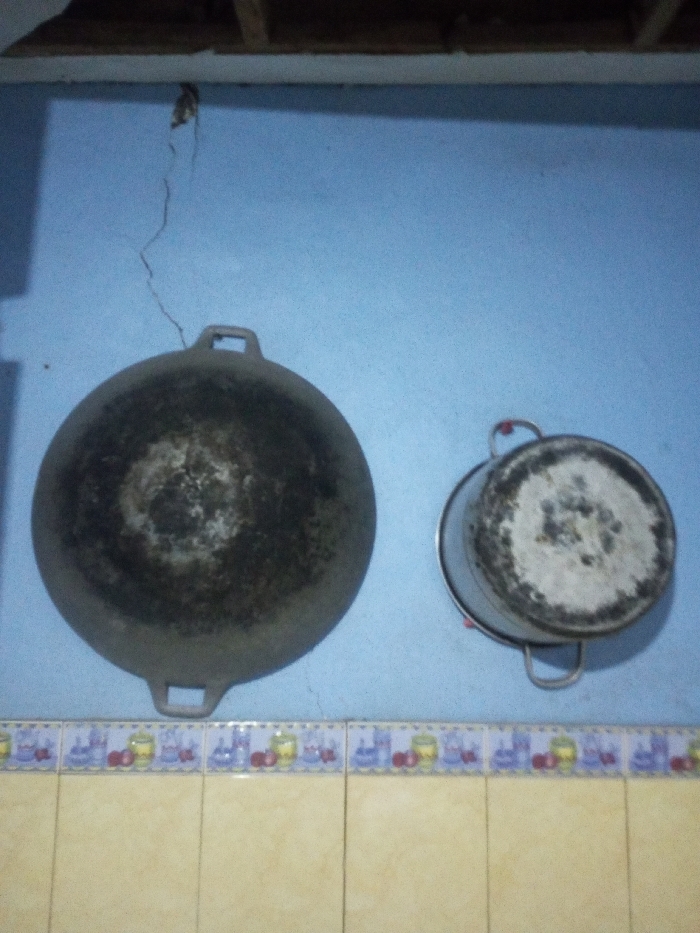 The scene depicts an interior wall in Balapur, India. The upper section of the wall is painted light blue, exhibiting a prominent vertical crack originating from the top margin and extending downwards on the left side. Directly below the crack, a large, dark, circular cooking pan with two square handles is mounted on the wall; its interior surface shows extensive dark charring and discoloration. To the right, a smaller, silver-toned metal pot with two loop handles is also mounted, displaying similar discoloration and wear on its bottom surface. Below the blue wall section, a decorative border of horizontal tiles features repeating patterns of colorful fruits and glassware. The lowest visible portion of the wall consists of vertical rectangular tiles in a light, uniform color, possibly cream or pale yellow. A dark, narrow beam or unpainted ceiling element is visible at the very top edge of the image.