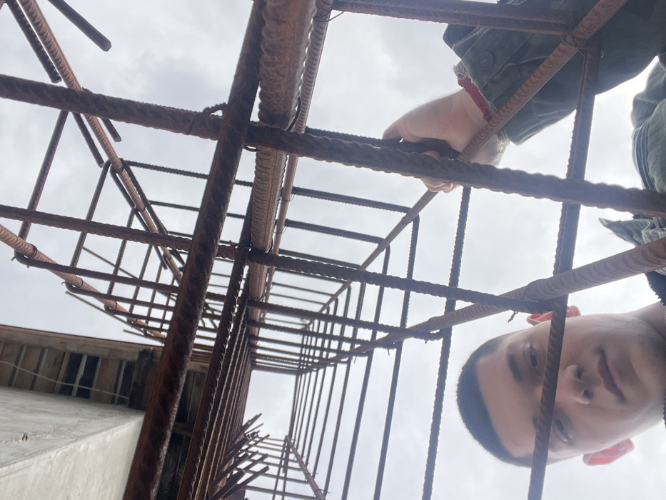 An image captured from a low-angle perspective looks upwards through a dense grid of rusty rebar, presumably part of a construction framework in Godech, Bulgaria. The rebar forms an intricate, interconnected structure of vertical and horizontal elements, showing evidence of tying wires at intersections. In the lower left quadrant, a portion of a male individual's head and left shoulder are visible. He has short, dark hair and is looking slightly downwards towards the camera. In the lower right quadrant, his right hand is seen grasping one of the vertical rebar elements. He is wearing a dark-colored jacket or shirt, and a red bracelet or band is visible on his right wrist. Above the rebar, an overcast sky is visible, dominating the background. In the upper left corner, a section of an unfinished concrete building structure is discernible, showing exposed wooden supports or formwork beneath a concrete slab.